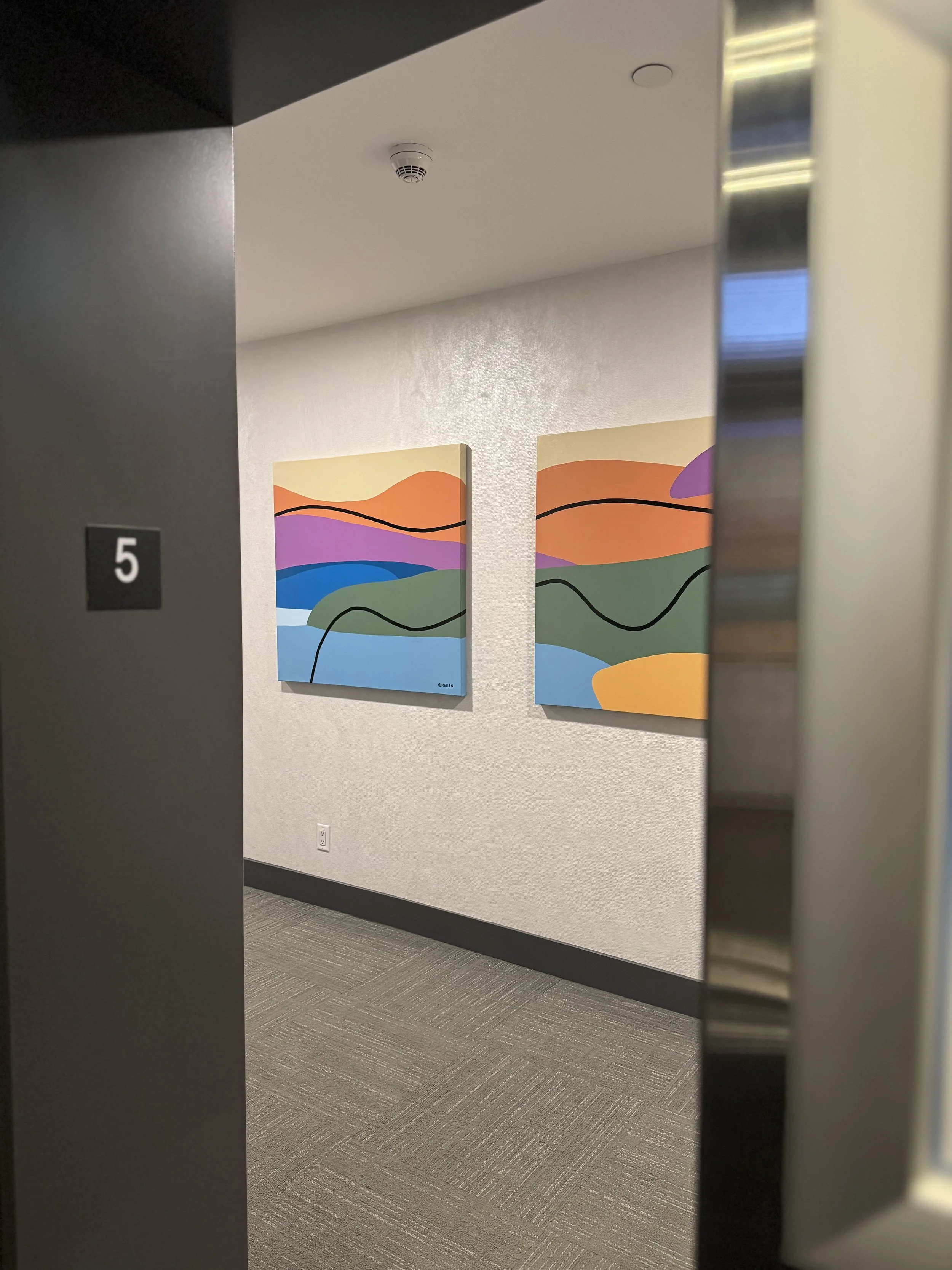 This triptych series for Level 6 at The Royal in Calgary reimagines existing panels by painting over the previous monotone graphics to create a vibrant, contemporary composition and presents an abstract minimalist interpretation of the landscape of Kananaskis Country in Alberta. Rather than depicting the terrain literally, the work distills the environment into restrained forms, quiet colour relationships, and subtle tonal shifts. Through reduction and simplification, the painting reflects the sense of scale, stillness, and expansive atmosphere that defines the region. The triptych format allows the landscape to unfold slowly across the panels, inviting contemplation and a personal reading of place.