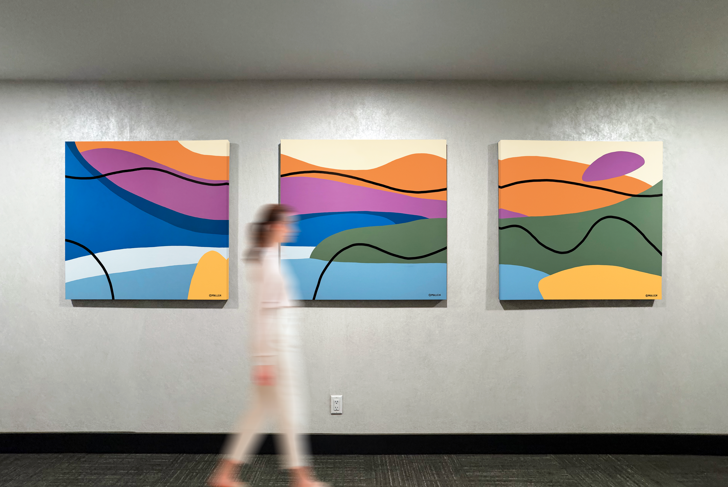 This triptych was commissioned for the Level 5 lift lobby of the Royal building in Calgary and presents an abstract minimalist interpretation of Moraine Lake at sunrise in Banff National Park. Rather than depicting the landscape literally, the work reduces the scene to flowing bands of colour and contour, capturing the quiet rhythm of light, water, and mountain forms as the day begins. Executed in acrylic on canvas with Posca black marker detailing and finished with a gloss varnish, the three panels read as both individual compositions and a continuous visual journey, designed to unfold as viewers move through the space. The result is a calm, contemporary installation that references place while remaining open, atmospheric, and meditative.